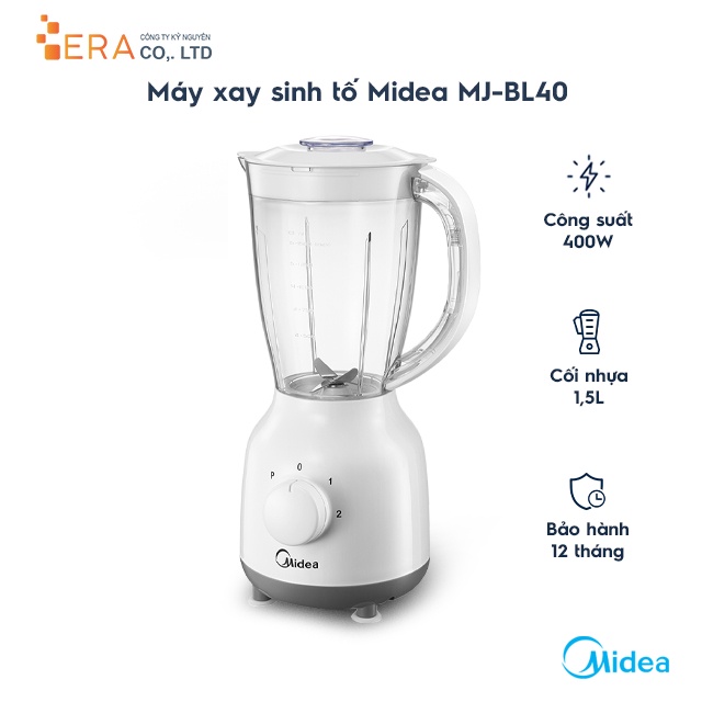 - Máy xay sinh tố Midea MJ-BL40 được thiết kế hiện đại với màu trắng trang nhã là lựa chọn phù hợp cho mọi gia đình.