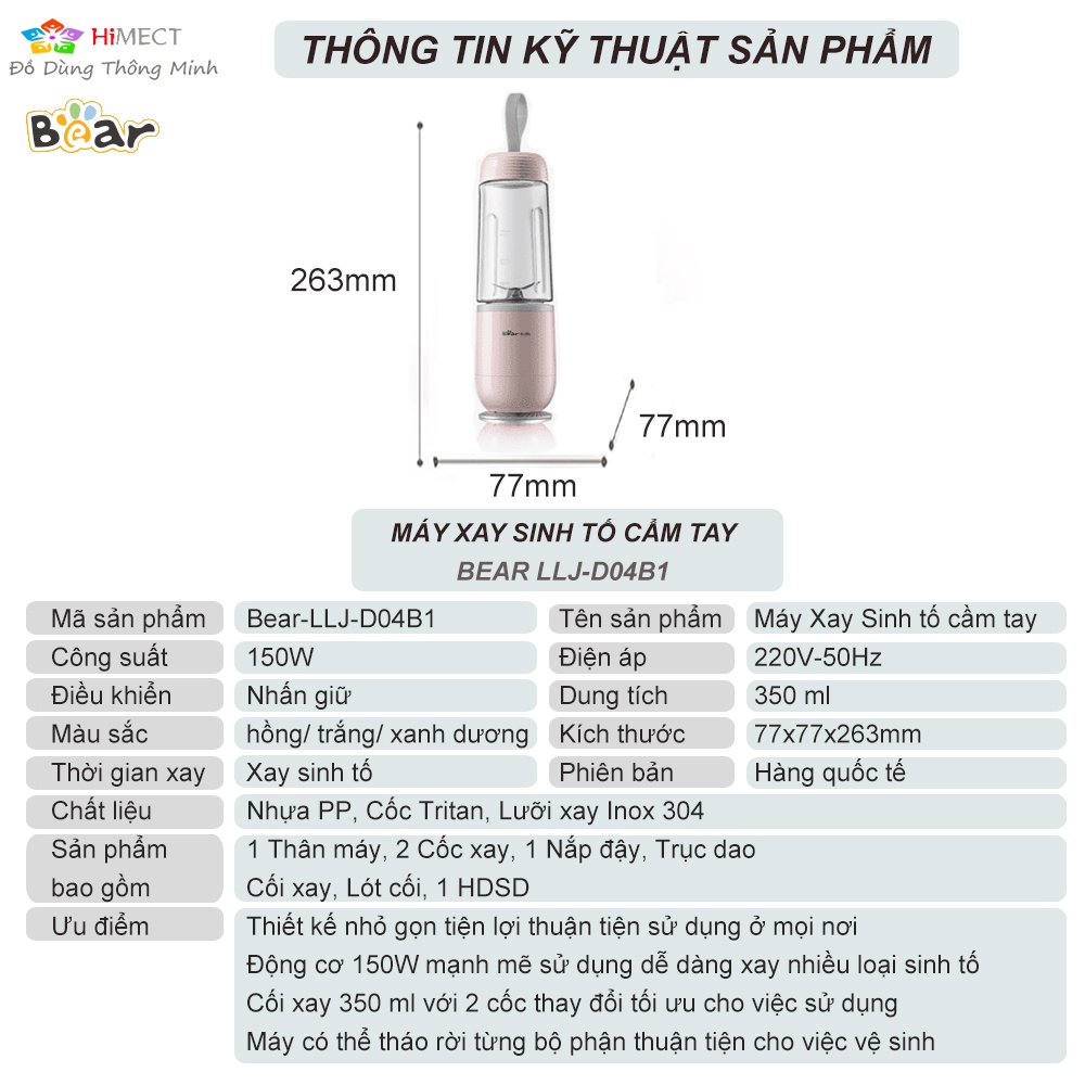 Máy Xay Sinh Tố Mini Cầm Tay Đa Năng Nhỏ Gọn 2 Cốc Thủy Tinh Cao Cấp Dung Tích 350Ml Bear LLJ-D04B1- HiMectMáy xay sinh tố mini là thiết bị chuyên dụng dùng để xay sinh tố. Máy có kích thước nhỏ gọn, trọng lượng nhẹ, rất dễ cầm trên tay và dễ mang theo bên người. Những chiếc máy xay như này thường có dung tích tối đa là 500ml
