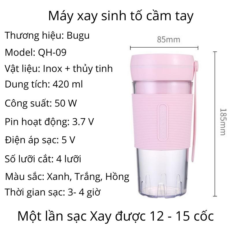 Thời gian giao hàng chỉ từ 1-3 ngày. Bảo hành 1 đổi 1 bởi BUGU Việt NamTên sản phẩm: Máy Xay Sinh Tố Mini Cầm Tay 420ml 4 Lưỡi Dao Thép Không Gỉ Có Pin Sạc USB Bugu QH-09