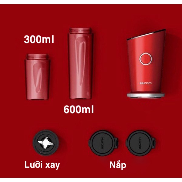 - Máy xay mini Hurom gồm có 2 cốc xay 300ml và 600ml, sau khi xay tháo nắp lưỡi xay ra và đậy nắp đi kèm vào là có ngay 1 cốc uống sinh tố đem theo đi học, đi làm.