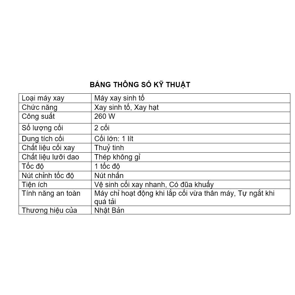 - Xay nhanh, xay nhuyễn mịn mọi thực phẩm với lưỡi dao sắc bén bằng thép không gỉ, công suất hoạt động 260W giúp bạn nhanh chóng chuẩn bị những ly sinh tố thơm ngon, sánh mịn cho gia đình thưởng thức.
