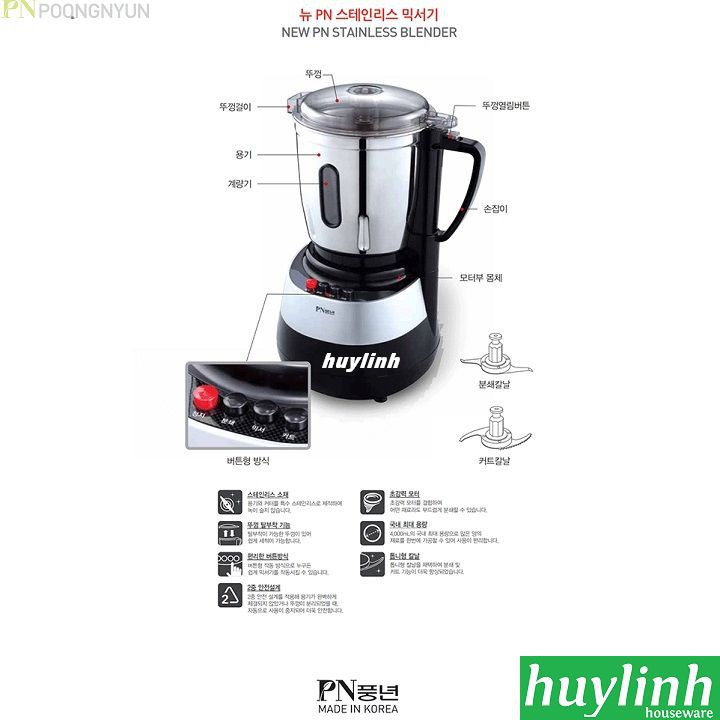 Máy xay sinh tố Poongnyun SMKANB-4000 được sản xuất tại Hàn Quốc, có chức năng xay sinh tố, nghiền thức ăn, băm nhỏ thức ăn và các loại hạt, có thể xay được đá. Sản phẩm phù hợp dành cho các quán kinh doanh.Sản phẩm được Huy Linh phân phối và bảo hành chính hãng