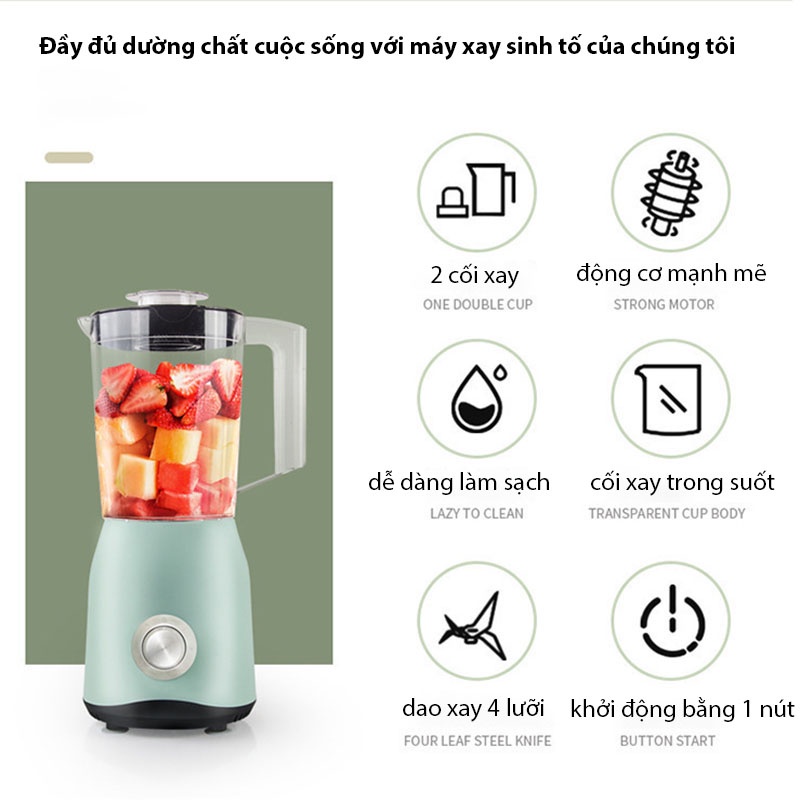 Máy xay hoạt động với công suất 1500W và lưỡi dao inox sắc bén, không gỉ sét, cấu tạo răng cưa đặc biệt sẽ nhanh chóng xay nhuyễn thực phẩm trong thời gian ngắn, giúp bạn dễ dàng có được những ly sinh tố thơm ngon, bổ dưỡng đồng thời tiết kiệm nhiều thời gian hơn cho cuộc sống.