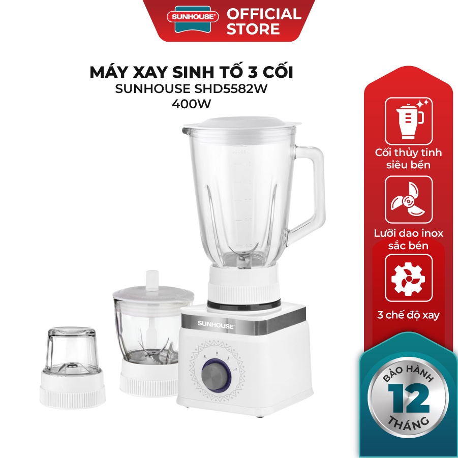 Máy xay sinh tố SUNHOUSE 3 cối màu trắng SHD5582W có thiết kế nhỏ gọn với 3 cối xay bằng thủy tinh trong suốt siêu bền, an toàn cho sức khỏe, thích hợp để sử dụng trong gia đình 3 – 5 người.