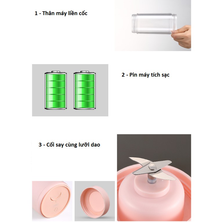 ( *** LƯU Ý : Sản phẩm là thiết bị cầm tay tiện lợi tích sạc pin lên công suất sẽ không thể như những dòng sản phẩm chạy điện cố định . Vì vậy sản phẩm sẽ phù hợp với những đồ xay mềm hoặc trái cây mềm : xoài, dưa hấu, bơ,... ***)