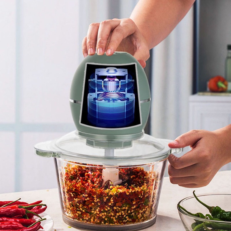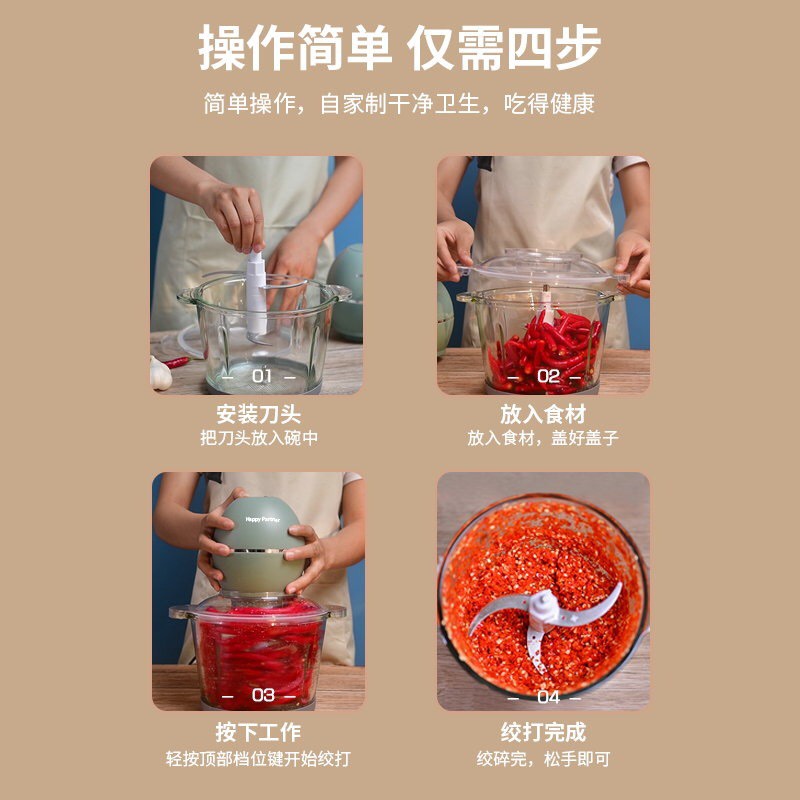 4. Kết nối nguồn điện. Nhấn công tắc. Cắt nhỏ thức ăn theo nhu cầu