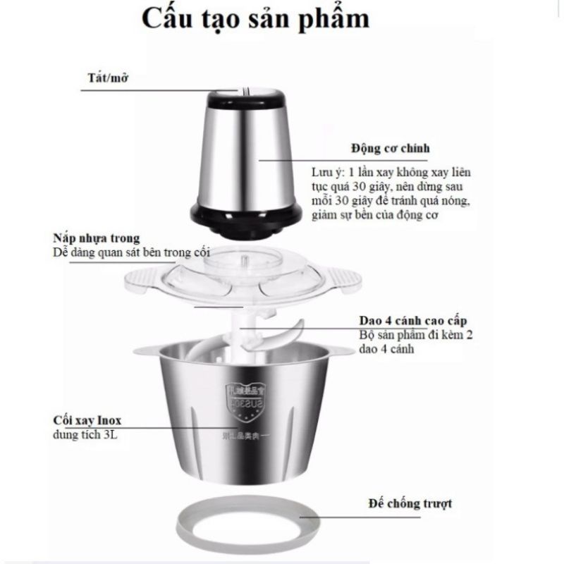 - Điểm đặc biệt của Máy xay thịt đa năng dung tích 3 lít lần này là thân cối làm từ chất liệu inox bền bỉ, tránh được việc gỉ sét, chống va đập sau thời gian dài sử dụng, an toàn cho sức khỏe cả gia đình.