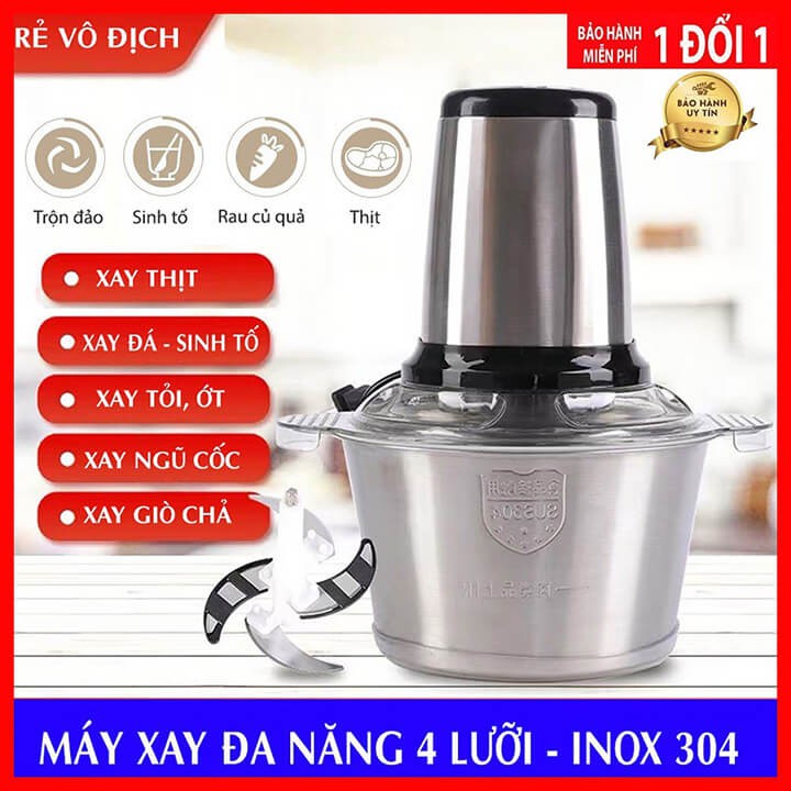 Máy xay thịt bằng tay 4 lưỡi, cối Inox 304, công suất 300w dung tích 2 lít[Xay mọi thứ] Máy xay sinh tố xay thực phẩm đa năng, xay hành tỏi ớt gừng xả, xay thịt, rau má,rau củ quả các loại,xay ép hoa quả ,xay cả đá...
