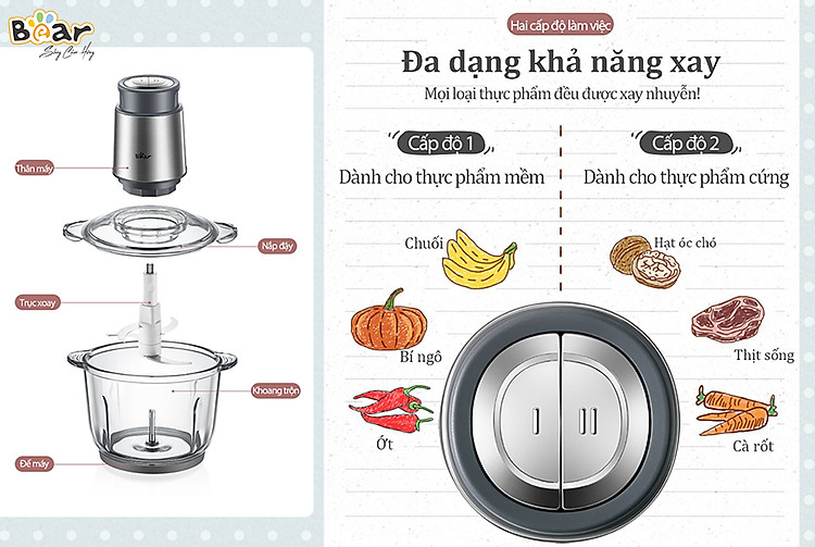 Điểm đặc biệt của chiếc máy xay đa năng Bear đó chính là được trang bị hẳn 2 chế độ xay khác nhau phù hợp với nhiều loại thực phẩm. Cấp độ 1 phù hợp xay cá loại thực phẩm mềm như rau, củ, quả, gia vị cấp độ 2 phù hợp xay các loại thực phẩm cứng và nhuyễn hơn như các loại hạt, thịt, cá, rau củ cứ