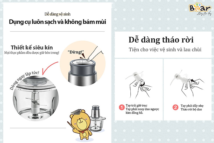 Máy xay đa năng Bear QSJ-B03Y7 có thiết kế tháo rời thông minh giúp bạn dễ dàng cất giữ và vệ sinh trong quá trình sử dụng và bảo quản. Phần cối xay và lưỡi dao xay có thể ngâm và rửa trực tiếp với nước, trục máy bên trên thiết kế chống bám bẩm dễ vệ sinh sạch sẽ khi lau chùi bằng khăn mềm.