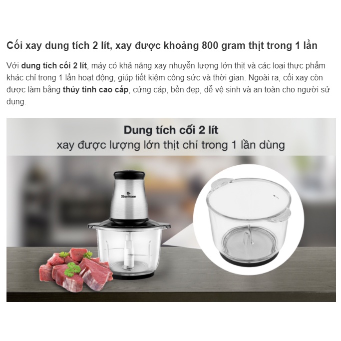 Đặc điểm nổi bật Máy xay thịt Bluestone CHB-5149Cối xay thủy tinh dung tích 2 lít xay được lượng lớn thịt trong 1 lần dùng.