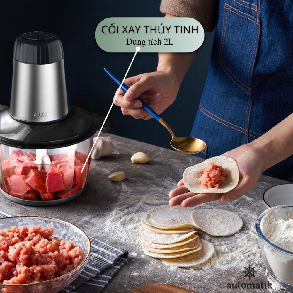 Máy Xay Thịt Cá Thủy Tinh 2 Lưỡi Dao Kép, Cối Xay Thịt Gia Đình 2L AUX + Tặng Dao Bào Củ Quả - Automatik