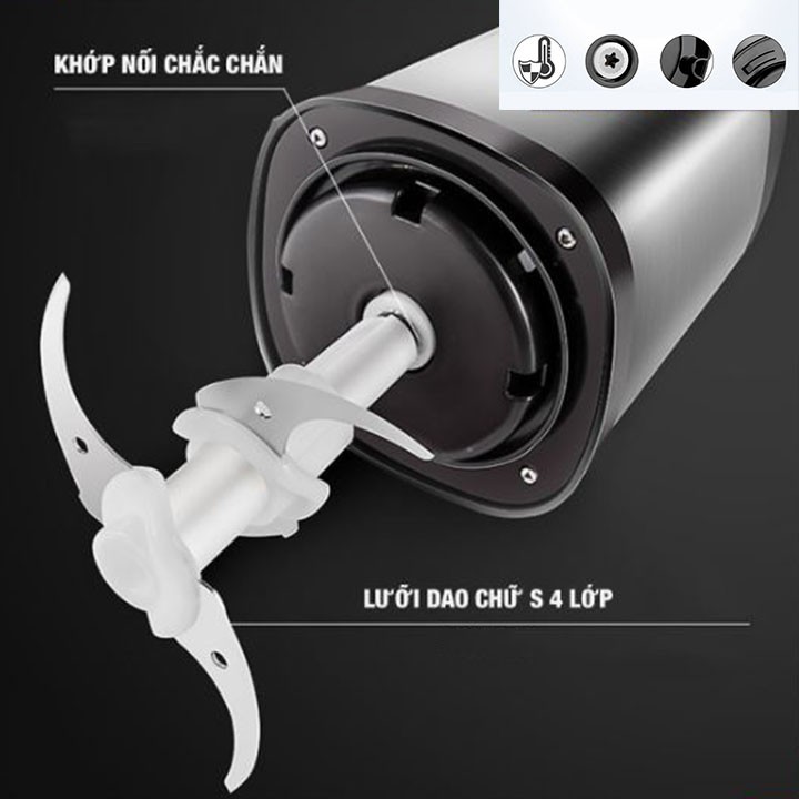 Sản phẩm được thiết kế với bộ lưỡi dao kép (4 lưỡi) thông minh và độc đáo kết hợp chất liệu thép không gỉ tạo nên lực cắt mạnh và độ sắc bén nhanh chóng xay thực phẩm nhuyễn chỉ trong 10-30s.