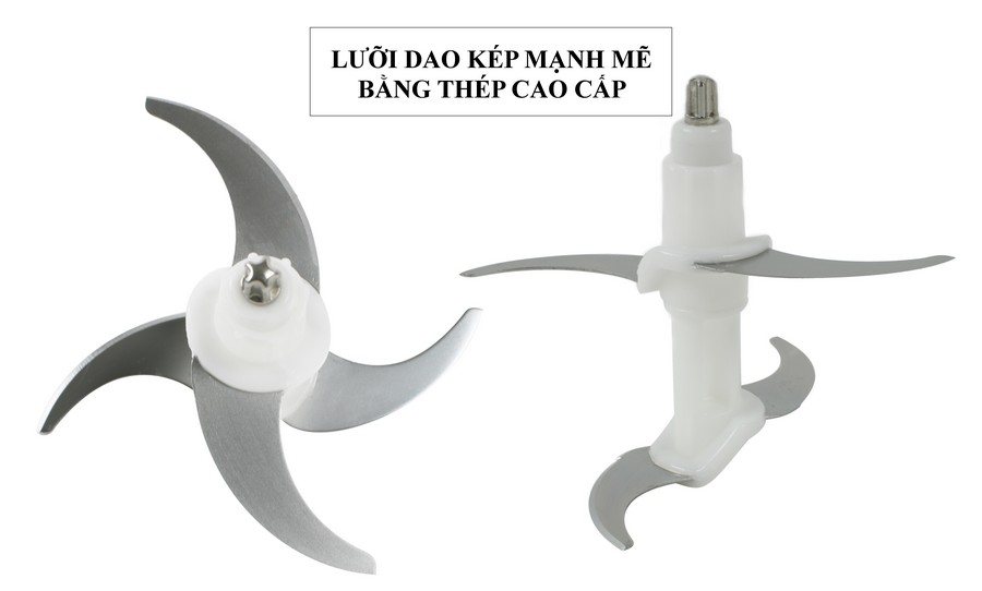 Lưỡi dao kép làm từ thép không gỉ, sắc bén và bền bỉ qua thời gian. Chất liệu dao giúp an toàn cho việc tiếp xúc với thực phẩm, thực phẩm được xay nhuyễn tốt nhất và không bị lẫn các tạp chất kim loại từ dao. Phần lưỡi dao gắn vào một trục nhựa có thể tháo rời để dễ chùi rửa, không gây nguy hiểm cho bạn.