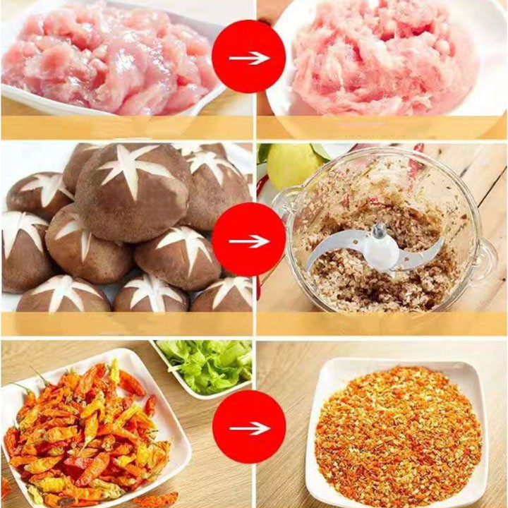 Cối có dung tích 2-3 lít có thể xay được 0.5 Kg thực phẩm, có thể sử dụng để xay các loại hạt và gia vị tiện lợi