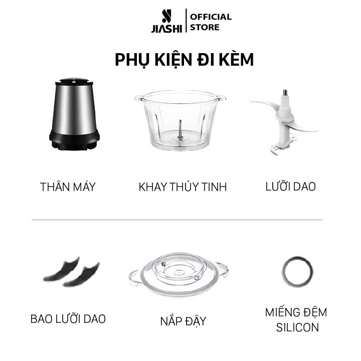 - Bộ sản phẩm gồm: 1 nắp đậy, 1 đầu máy, 1 cốc chứa thực phẩm, dụng cụ xay