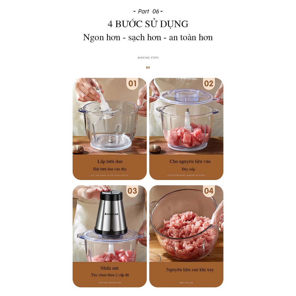 Máy xay thịt đa năng CHIGO sẽ giải quyết nỗi lo vệ sinh an toàn của gia đình bạn. Vệ sinh thực phẩm khi xay thịt ở ngoài chợ tiềm ẩn nhiều nguy cơ như vệ sinh máy kém, bẩn, vi khuẩn. Những nguyên nhân này sẽ ảnh hưởng hưởng tới sức khỏe gia đình mìnhThông số sản phẩm máy xay thực phẩm đa năng: