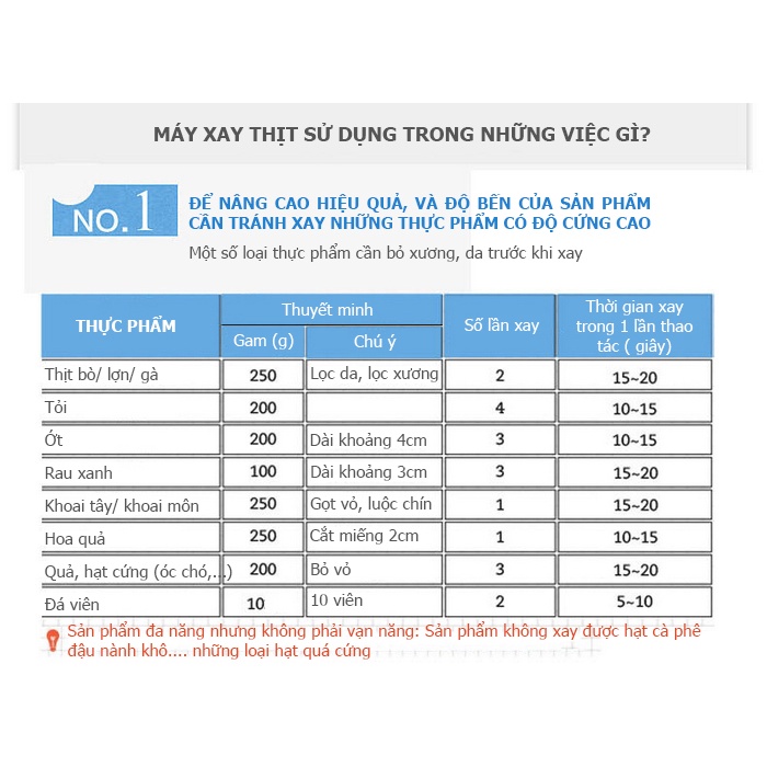 - Công dụng: Xay thịt, cá và các loại nguyên liệu thực phẩm mềm (rau củ quả)