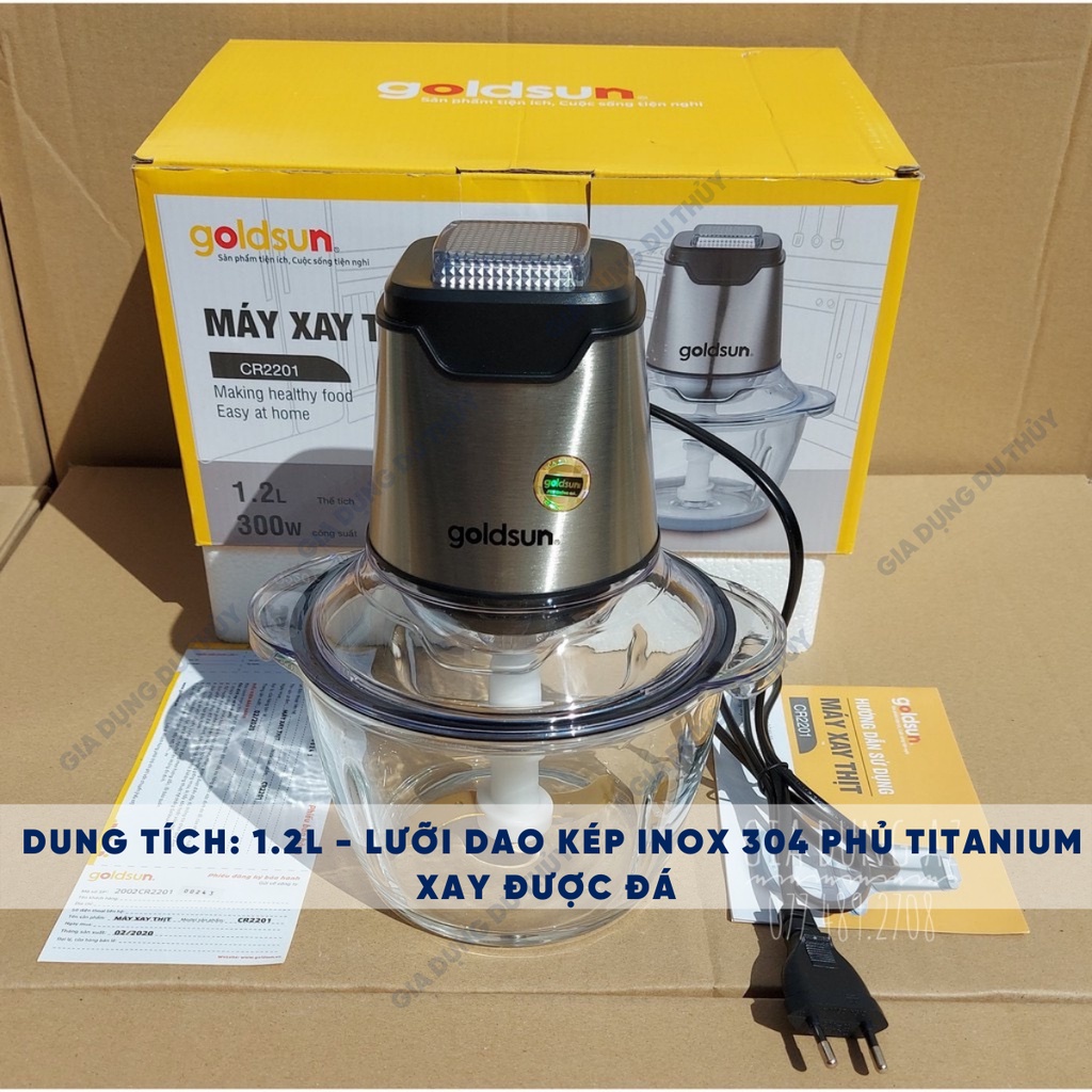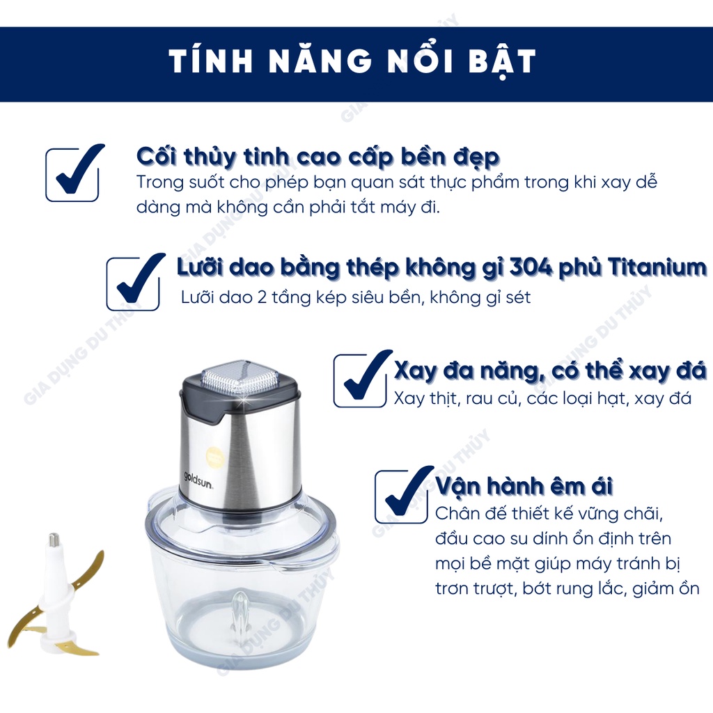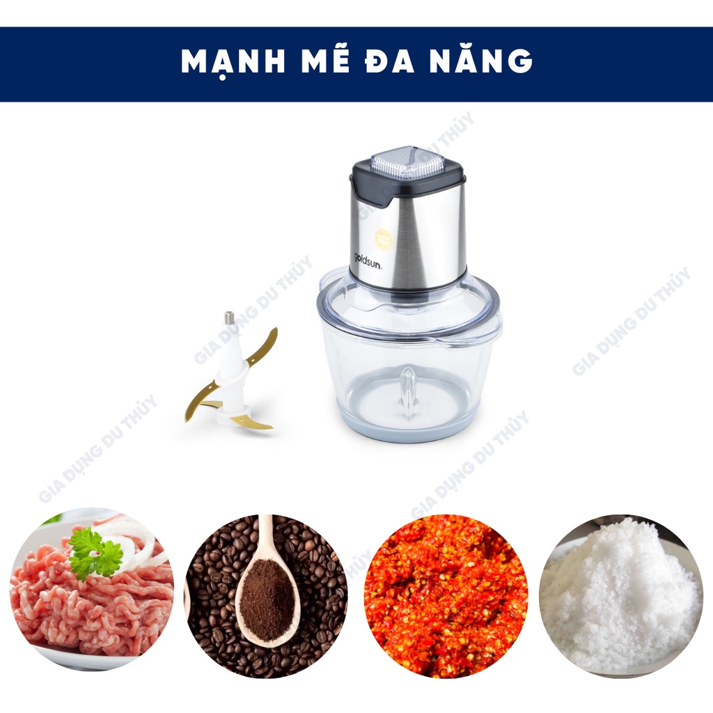 Thiết Bị Điện Gia Dụng > Đồ gia dụng nhà bếp > Máy chế biến thực phẩm & Xay thịt || Máy xay thịt đa năng Goldsun lưỡi dao 2 tầng kép inox 304 phủ titanium siêu bền, siêu bén 1L2 300W bảo hành 12 thángCòn hàng