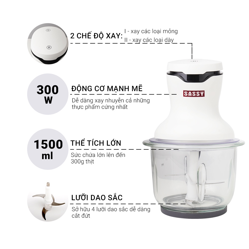 MÁY XAY ĐA NĂNG 4 LƯỠI DAO SASSYThiết kế tinh gọn, hiện đại, Máy xay thịt đa năng Sassy xứng đáng là trợ thủ đắc lực cho các mẹ để bé có những bữa ăn ngon miệng và bổ dưỡng. Tiết kiệm thời gian, đa công dụng, máy xay thịt Sassy ngày được một sử dụng nhiều hơn trong gian bếp gia đình. Đặc biệt, với khả năng xay nhuyễn, nhỏ được lượng lớn thực phẩm trong 1 lần, sản phẩm máy xay thịt Sassy thích hợp sử dụng cho các gia đình có trẻ em hoặc đông người.