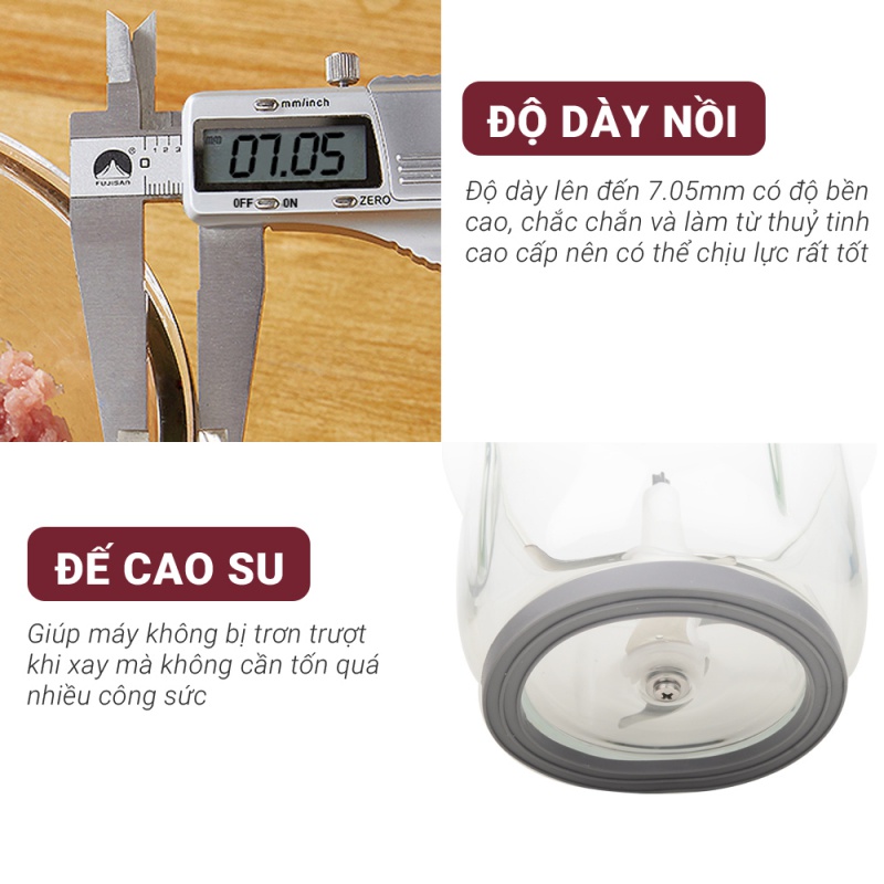 - Chất liệu cối: Cối xay thủy tinh borosilicate dày đến 7mm, chịu lực tốt
