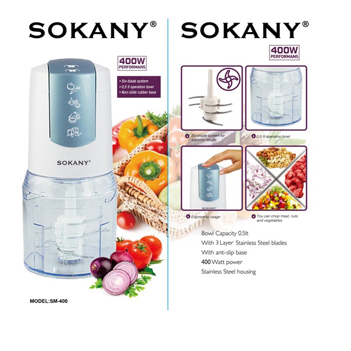 - Máy xay thịt SOKANY sở hữu kiểu dáng nhỏ gọn. Đem lại sự tiện lợi và giúp tiết kiệm thời gian cũng như công sức cho người nội trợ. Sản phẩm chuyên dùng xay thịt tiện dụng, ngoài ra còn có thể xay hoa quả, các loại hạt và các thực phẩm khác.