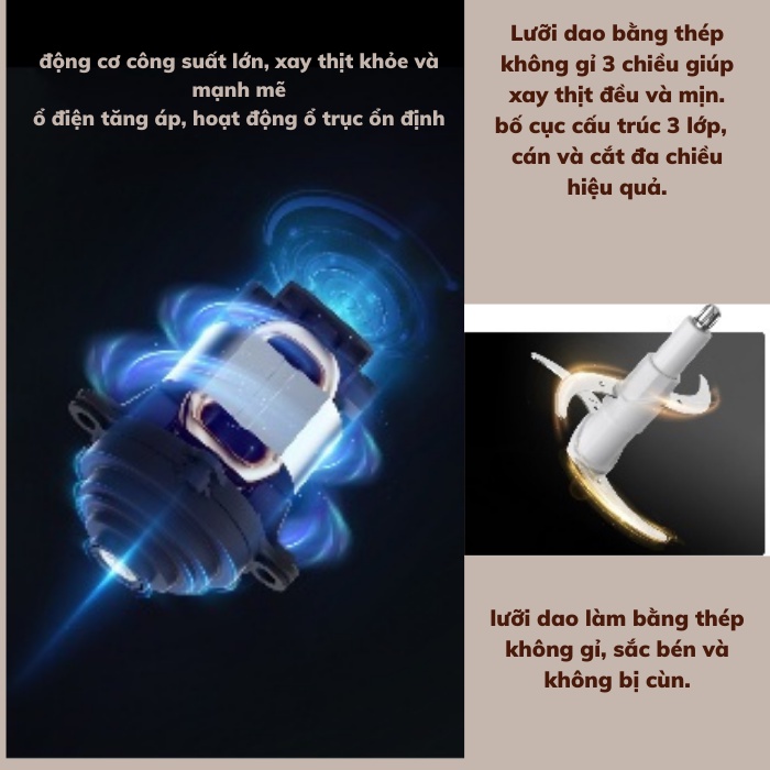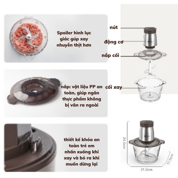 + Thiết kế lưỡi dao kép, xay nhuyễn nhừ nhanh các đồ như thịt cá, rau củ quả, ớt, tỏi, chỉ trong vòng tích tắc