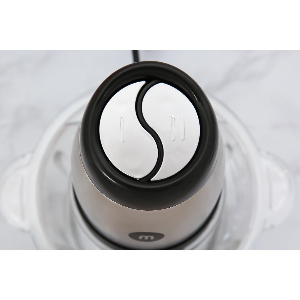 Ngay trên đầu bộ phận motor máy xay là 2 nút điều chỉnh cấp “I” và “II”, bạn chỉ việc bỏ thực phẩm vào cối, và gắn đầu motor vào và lựa chọn mức độ xay thích hợp tùy loại thực phẩm. Thiết kế nút nhấn bằng bạc nằm kề nhau, giúp bạn thao tác bấm xay được thoải mái hơn.