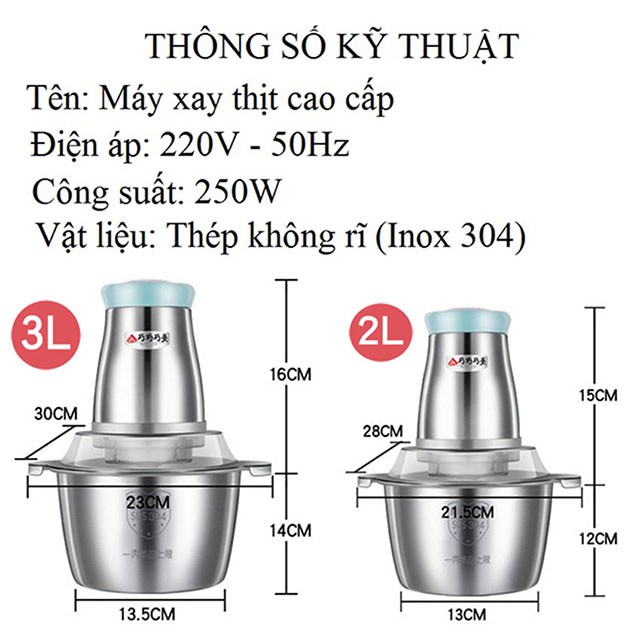 ✔️ Dung tích cối lớn 2 lít và 3 lít làm bằng inox 304 cao cấp