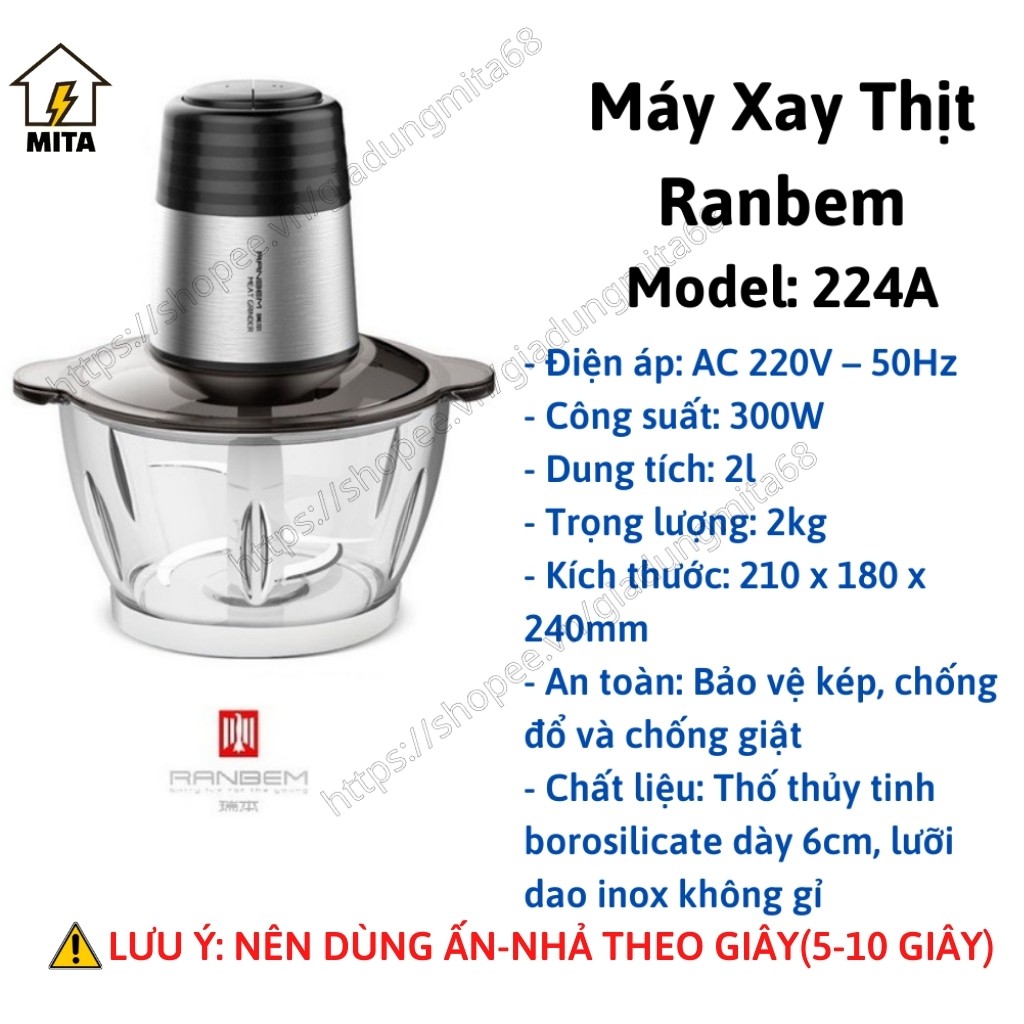 ⚠️LƯU Ý: NÊN DÙNG THEO ẤN-NHẢ THEO GIÂY(5-10 GIÂY) , TUYỆT ĐỐI KHÔNG GIỮ LÂU SẼ GÂY RA TÌNH TRẠNG MÁY QUÁ CÔNG SUẤT TẠM NGỪNG HOẠT ĐỘNG, THẬM CHÍ LÀ DẪN ĐẾN CHÁY MÁY.▶ Thiết kế đẹp mắt hiện đại, phù hợp không gian bếp của bạn, vận hành tối ưu. Máy xay thịt Ranbem 224A được thiết kế với 2 tốc độ cùng hệ thống lưỡi dao kép xay nhuyễn được nhiều loại thực phẩm như thịt, cá, rau quả,... . Phần thân trên động cơ được phối thiết kế inox sang trọng với lớp cách điện bên trong.