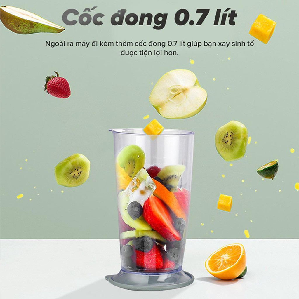 - Máy xay sinh tố có cốc đong chất liệu AS dung tích 700 ml, nhỏ gọn nhẹ rất tiện dụng khi nấu đồ ăn dặm cho bé.
