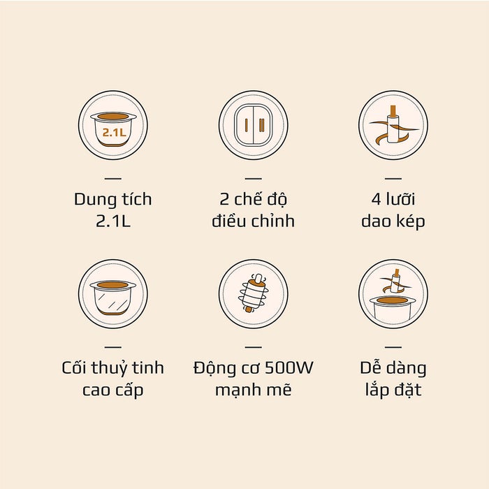 - Dung tích cối xay lớn lên tới 2.1L có thể xay được lượng thực phẩm lớn, tương đương với 800g thịt cùng một lúc, đủ thực phẩm cho 4-6 người dùng thoải mái, tha hồ thưởng thức nhiều món ngon khác nhau.