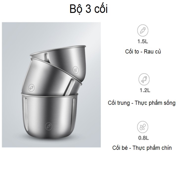 - Bộ sản phẩm bao gồm: 03 cối inox (1.5l; 1.2l; 0.8l) - 01 cục thân máy - 01 nắp cối - 01 dao xay - 01 dụng cụ bóc tỏi - 01 lót cối chống trượt