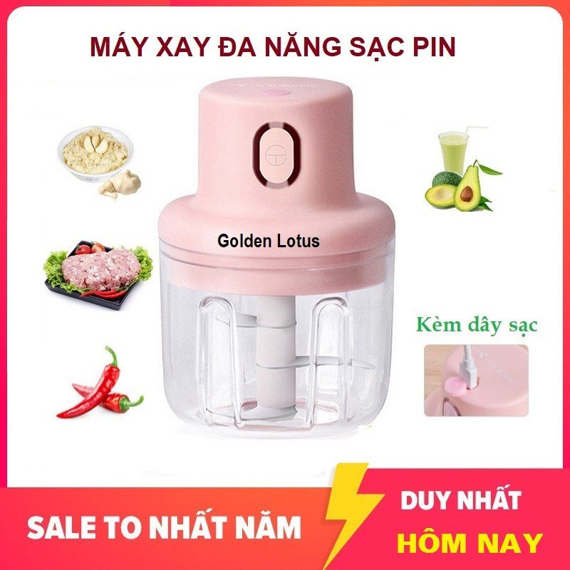 Máy Xay Thực Phẩm Mini Nắp Hồng Sạc Điện Cầm Tay, Có Cổng Sạc Usb, Xay Hành, Tỏi, Thịt, Rau Củ Quả 250ml