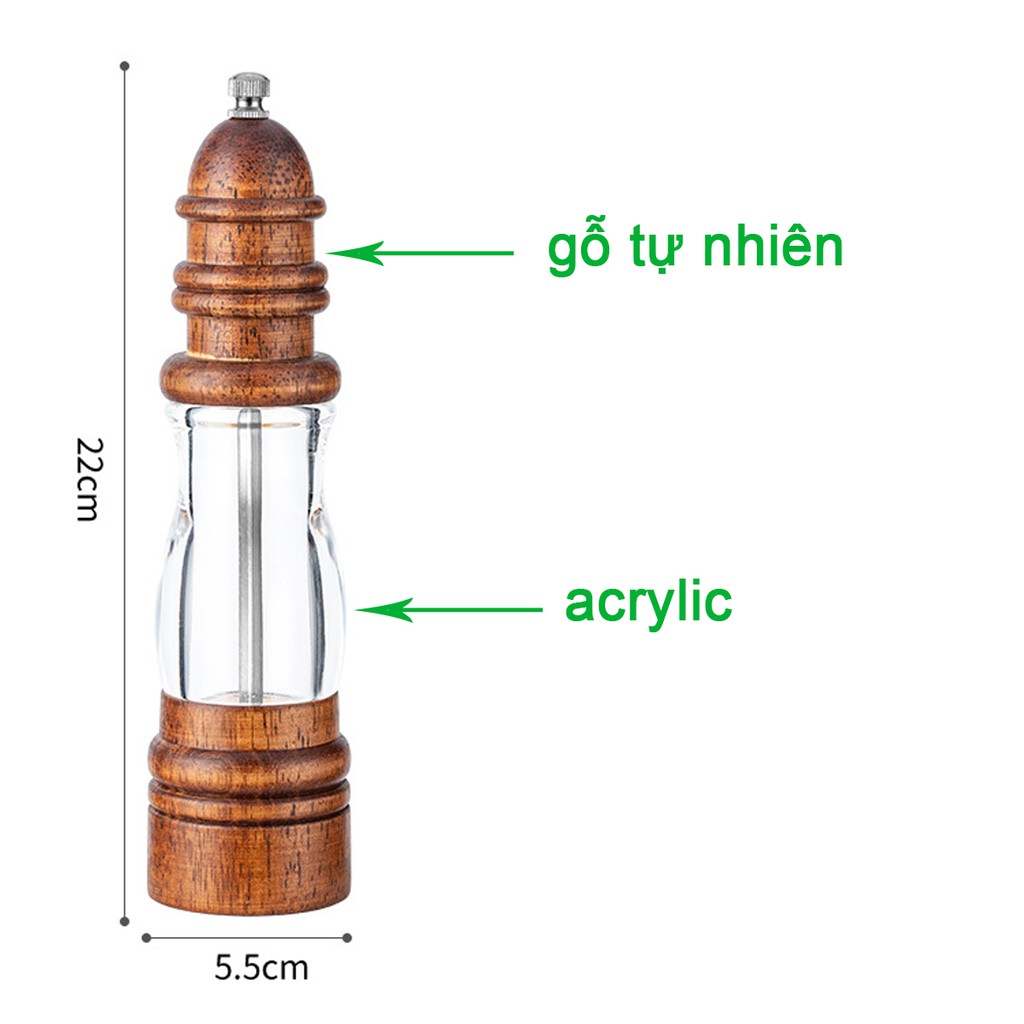 Lọ xay tiêu cầm tay với vỏ làm từ gỗ tự nhiên kết hợp acrylic trong suốtDụng cụ xay tiêu GA09 có thiết kế sang trọng với kểu dáng hiện đại pha lẫn nét cổ điển. Mang đến sự tiện lợi và thẩm mỹ cho gian bếp của bạn