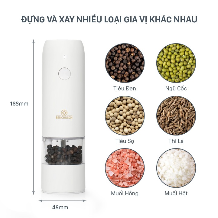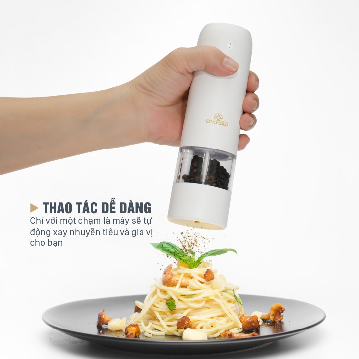 GIỚI THIỆU SẢN PHẨM “MÁY XAY TIÊU TỰ ĐỘNG BẰNG ĐIỆN BENCHUSCH”Một dụng cụ xay tiêu “toàn năng” vừa tự động xay, vừa gọn nhẹ, tiện lợi, lại không cần phải thay pin phiền phức, mà ai trong gia đình mình đều có thể dễ dàng sử dụng được.