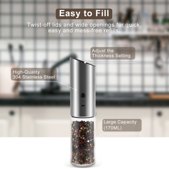 Thiết Bị Điện Gia Dụng > Đồ gia dụng nhà bếp > Máy chế biến thực phẩm & Xay thịt || Máy xay tiêu tự động sử dụng pin sạc vỏ inox cao cấpCòn hàng