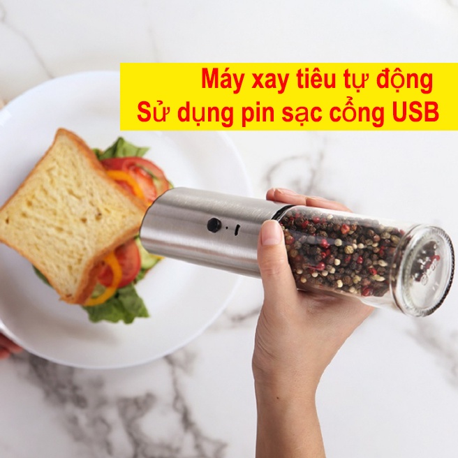 Máy xay tiêu tự động sử dụng pin sạc vỏ inox cao cấp