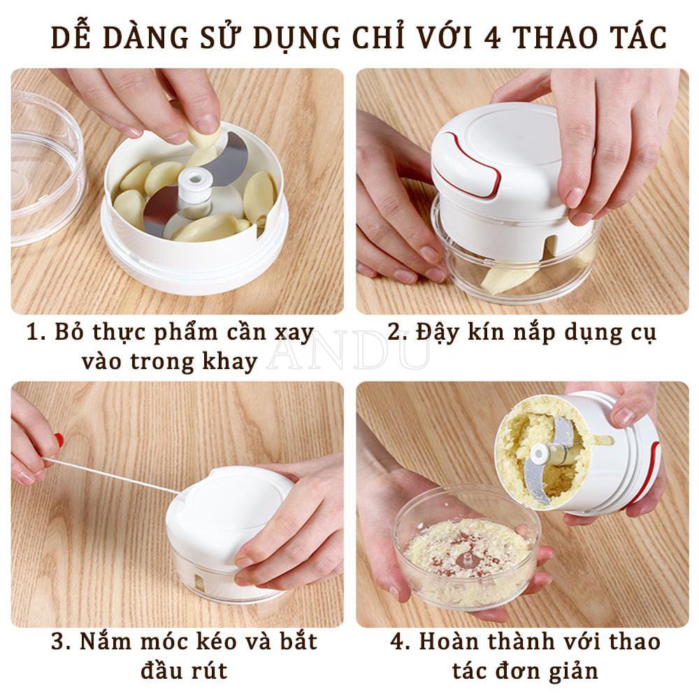 Cực dễ dàng, chỉ cần cho đồ vào, đậy nắp, kéo & thả phần dây kéo liên tục, dây kéo sẽ làm quay lưỡi cắt bên trong, xay nhuyễn đồ ăn không hề vất vả. Dùng được mọi lúc mọi nơi, ko cần điện.