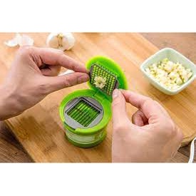 Máy xay tỏi mini với vỏ làm bằng nhựa, có những lưỡi dao tạo thành một màng lưới có thể sử dụng để cắt thức ăn mềm hoặc cứng một cách dễ dàng.