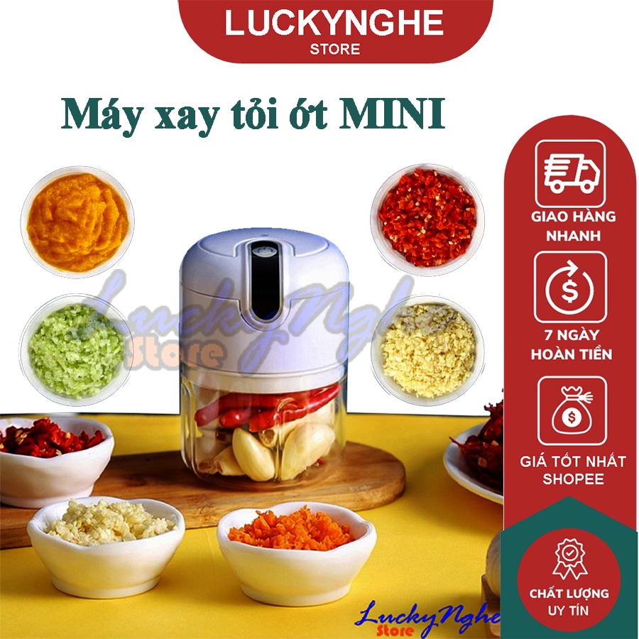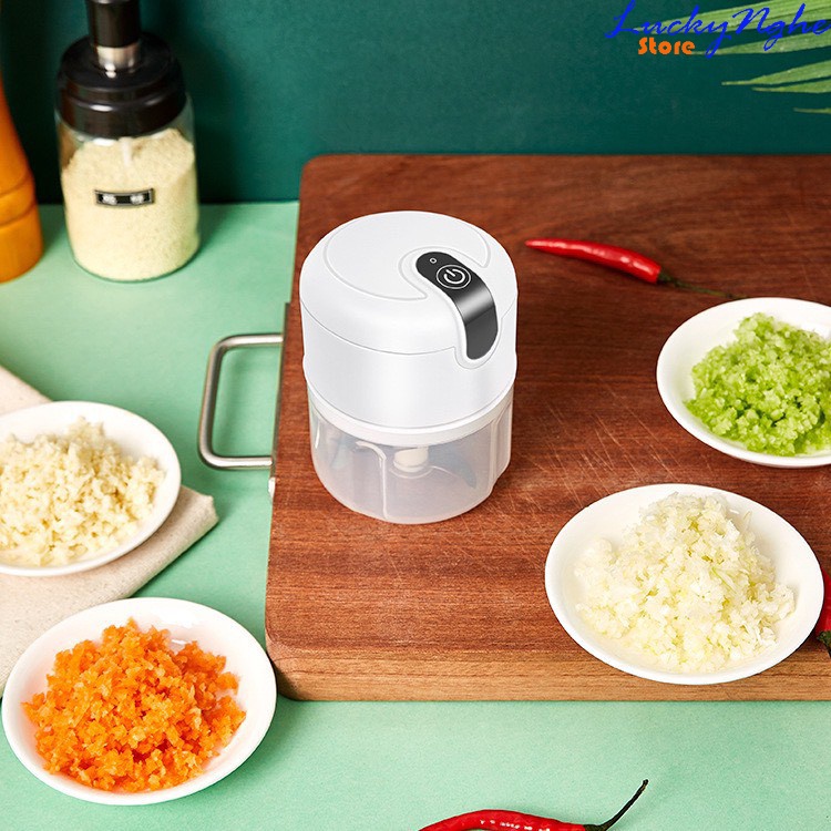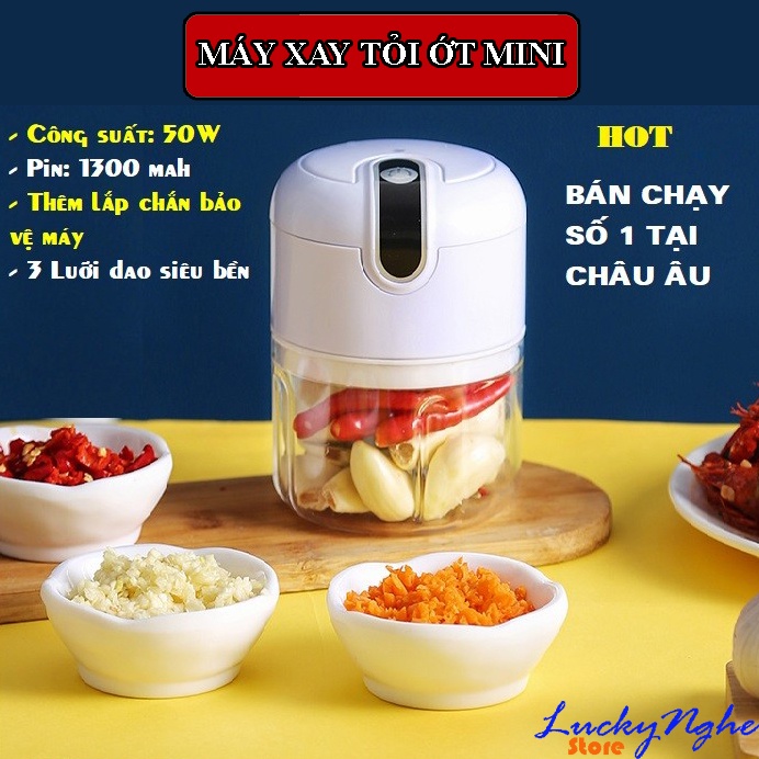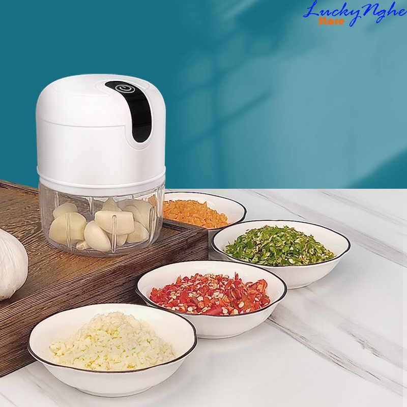 Máy xay tỏi ớt mini sạc điện 3 lưỡi, có cổng USB sạc, dung tích 250ml công suất 50w nhỏ gọn• Không dây màu, mùi khó chịu lên tay, mắt mũi của bạn khi sử dụng như các dụng cụ thông thường khác.