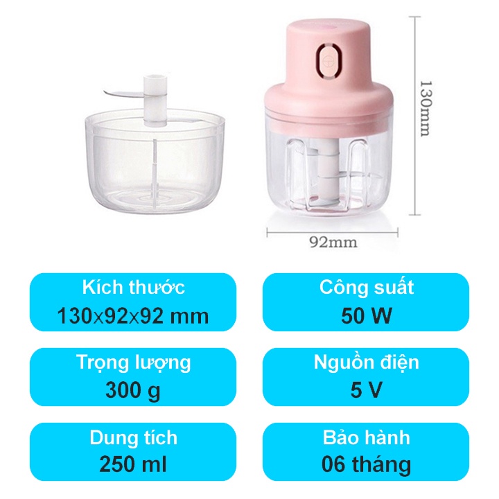 Thông số sản phẩm Máy Xay Tỏi, Ớt, Rau Củ, Thịt Cá Cầm Tay Mini, Có Sạc Pin, Dung Tích 250ml: