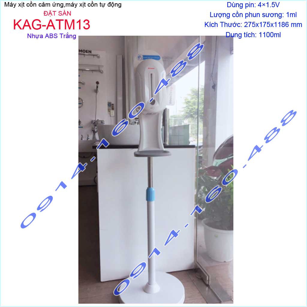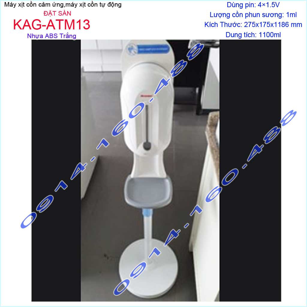 Máy xịt cồn cảm ứng Atmor KAG-ATM13 đặt sàn đế trắng, Máy phun cồn tự động 1.1 lít dùng pin cho trường họcKích thước Dài 28cmx rộng 18cm x cao 120cm. Dung tích bình đựng: 1100ml (1.1 lít)