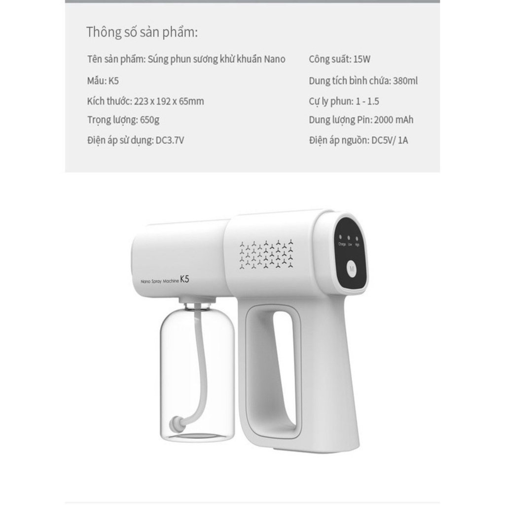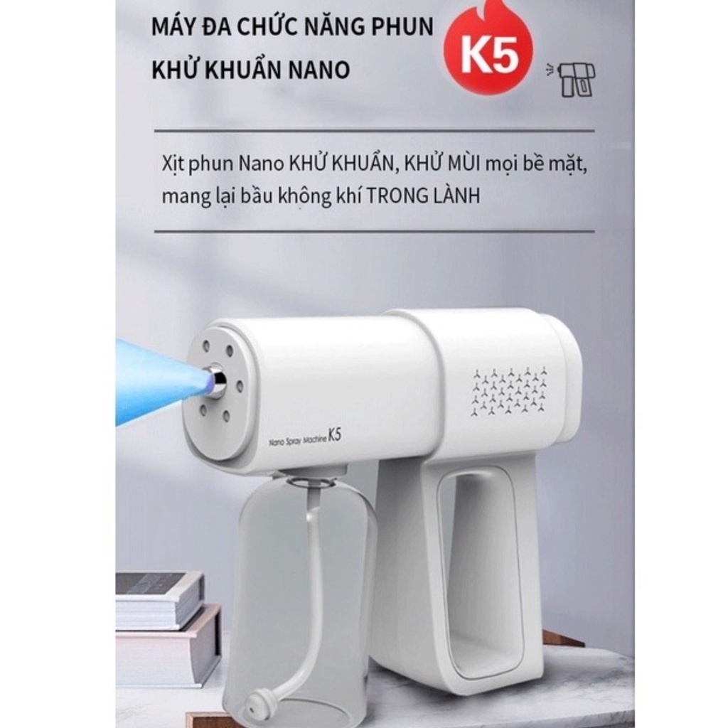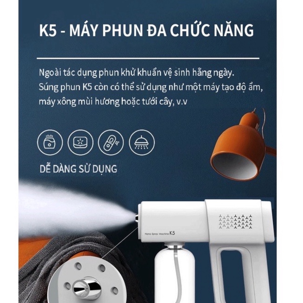 Súng xịt khử khuẩn cầm tay Nano K5 là thiết bị dùng phun các loại dung dịch sát khuẩn (Arusan, Chloramin B) thân máy nhỏ gọn dễ cầm, dễ mang theo. Có khả năng diệt virus nhanh trong môi trường và cơ thể. Máy phun dung dịch khử trùng K5 dùng pin sạch, 2 chế độ phun thích hợp cho gia đình, xe hơi, văn phòng, đi du lịch, khử trùng quần áo, nhà vệ sinh …