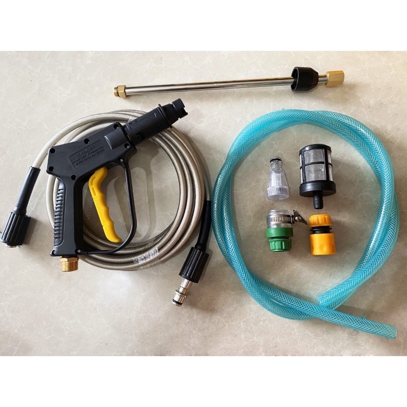 - Phụ kiện đi kèm: dây xịt 8m, dây hút 1.5m, súng xịt, bình bọt tuyết, cây nối dài cho súng xịt, lọc rác, cục nối nhanh bằng đồng