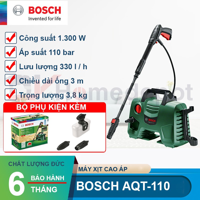 Máy xịt rửa cao áp Bosch AQT 110 được Bosch tung ra thị trường nhằm mục đích hỗ trợ cho nhu cầu rửa xe máy hay những công việc dọn dẹp hàng ngày trong gia đình.ĐIỂM NỔI BẬT MÁY XỊT RỬA CAO ÁP AQT 110