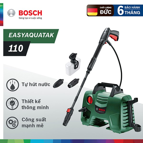 SẢN PHẨM GỒM : Máy EasyAquatak 110, Đầu phun đầu chỉnh tia, Đầu phun xoay, Đầu phun xà phòng 450ml, Dây áp lực 3m, Đầu lọc nước, Súng tiêu chuẩn Bosch, Ống nối áp lực