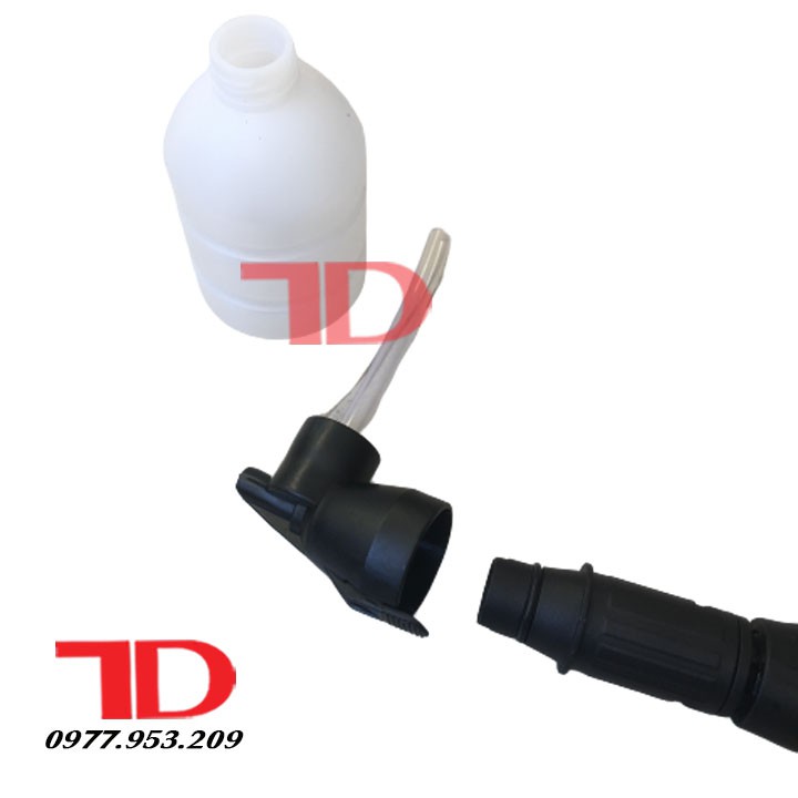 Bước 2: Dùng dây ống còn lại (màu đen) gắn 1 đầu với súng xịt, đầu còn lại gắn vào thân máy.