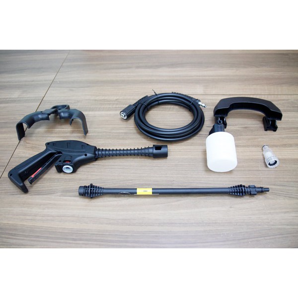 Phụ kiện đi kèm như hình bên dưới: Phụ kiện đi kèm như hình bên: 1 súng phun, 1 đầu phun, dây phun cao áp: 5m, đầu phun có bình tạo bọt. Máy có bổ sung thêm bộ phận lọc cho tất cả các máy xịt rửa (Transparent Filter). Chú ý dùng vòi nước để lấy nước từ nguồn nước vào máy xịt rửa nên có chiều dài tối đa 2.5-3m.