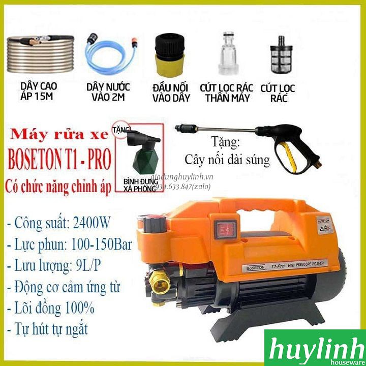 Giới thiệu Máy xịt rửa xe Chỉnh Áp BoSeton T1 PRO - 2400W - Tặng béc rửa máy lạnh - Dây 15 mét (Osaka)